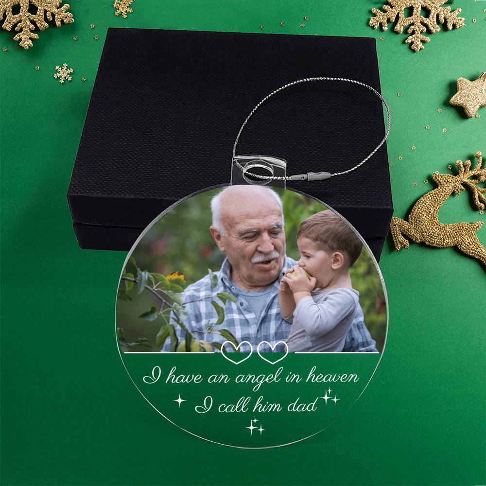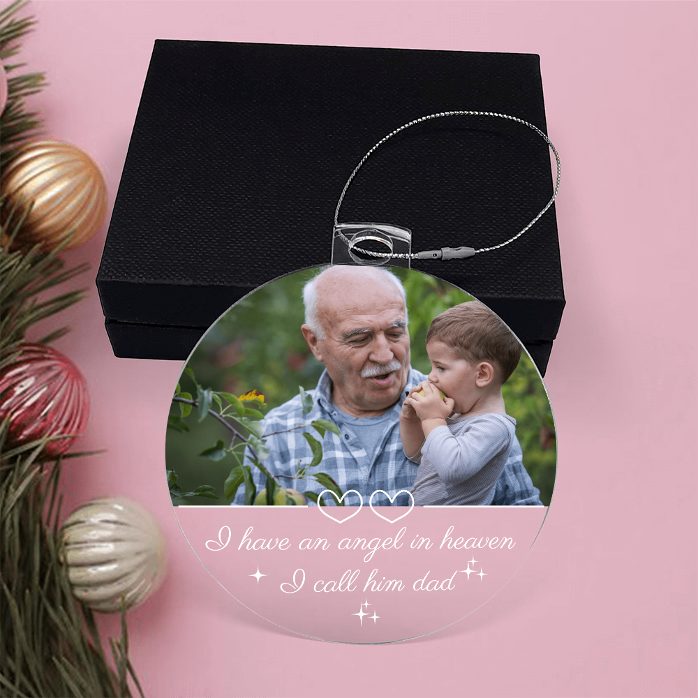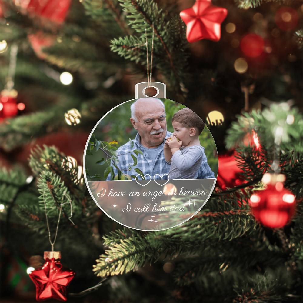 Keep the memory of your loved one shining bright this Christmas with a heartfelt keepsake that brings comfort and warmth. This custom memorial ornament features your favorite photo and the touching quote “I have an angel in heaven, I call him Dad.” — a beautiful reminder that love never fades, even across heaven and earth.