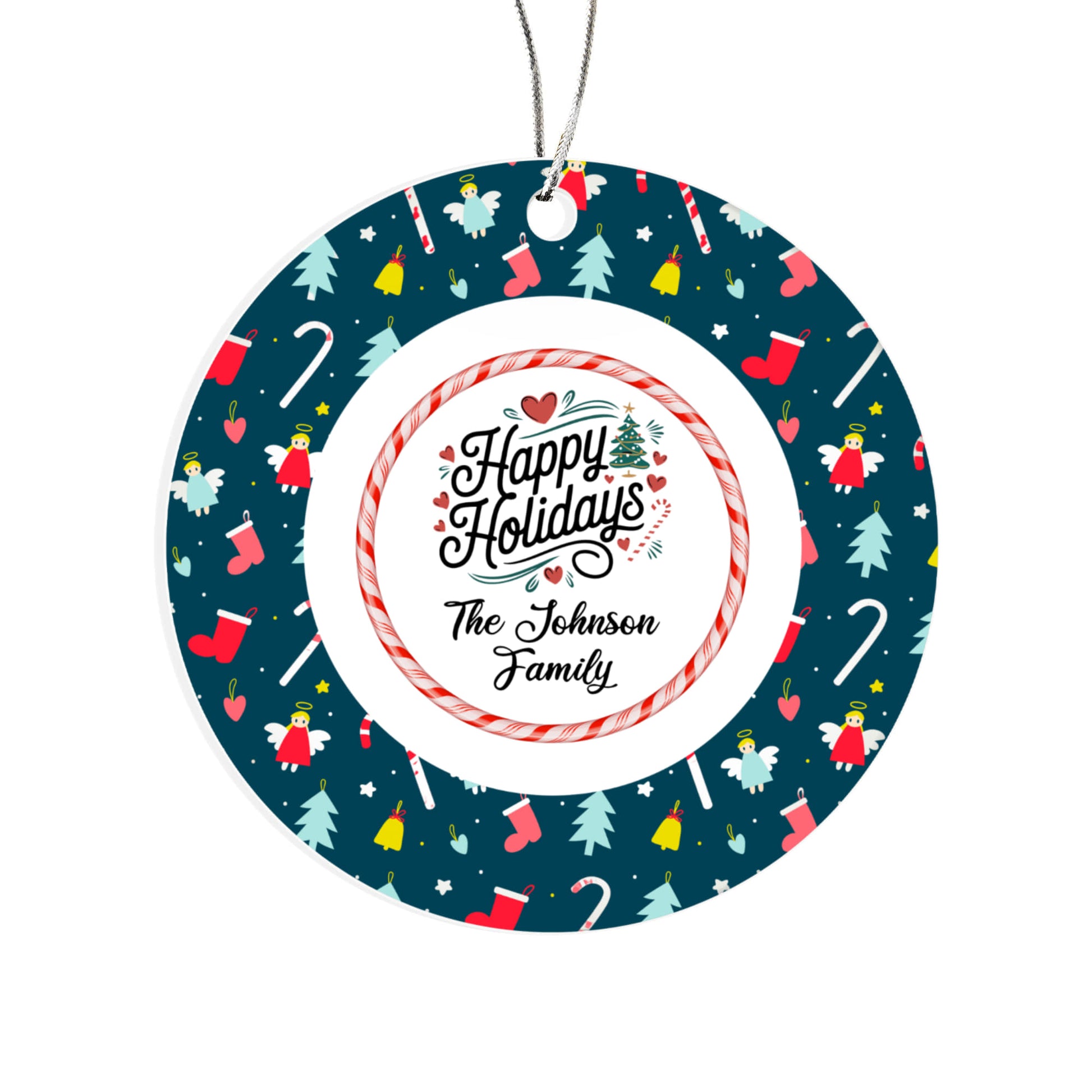 Beautifully designed with festive holiday patterns and the message “Happy Holidays”, this ornament becomes truly one-of-a-kind when customized with your family’s name.