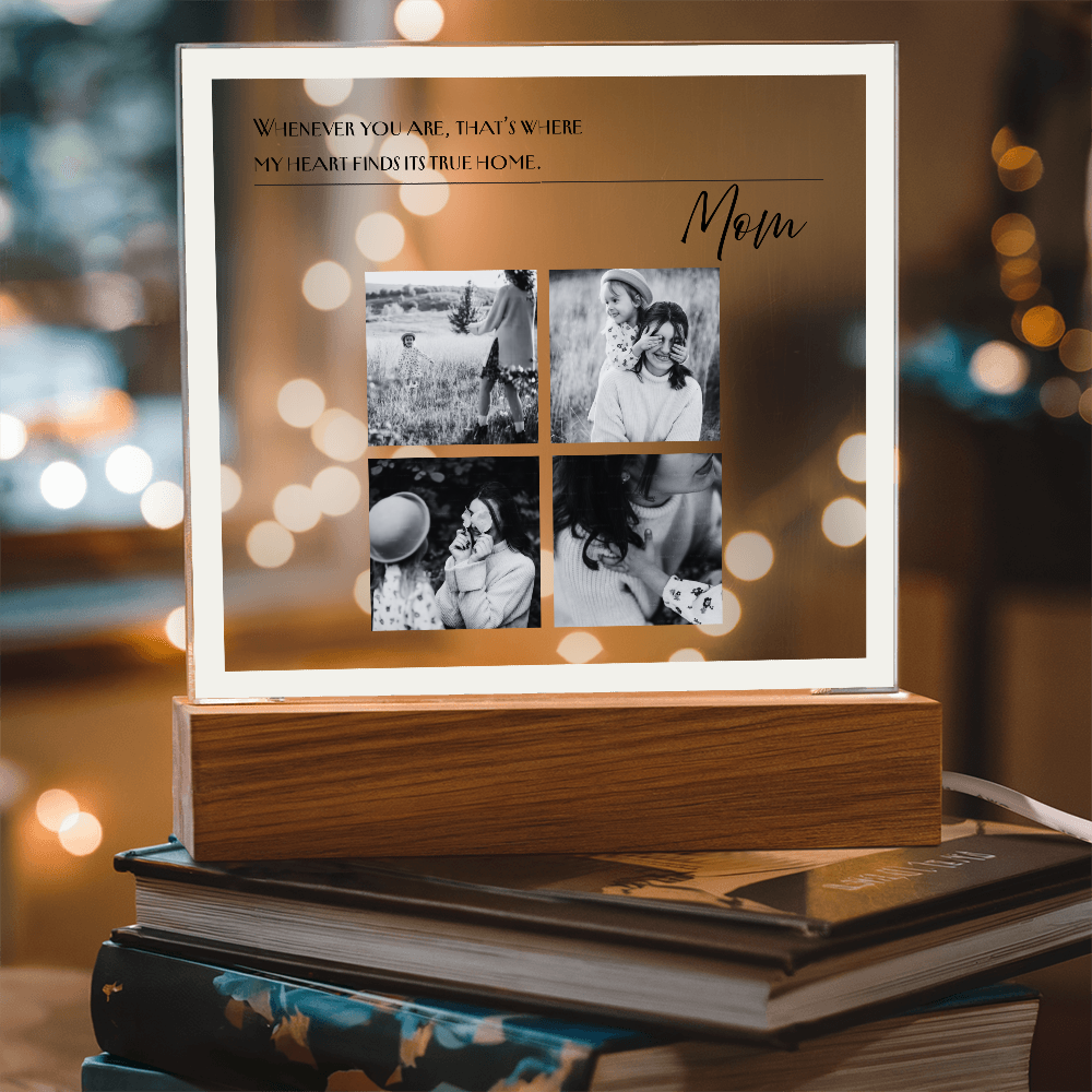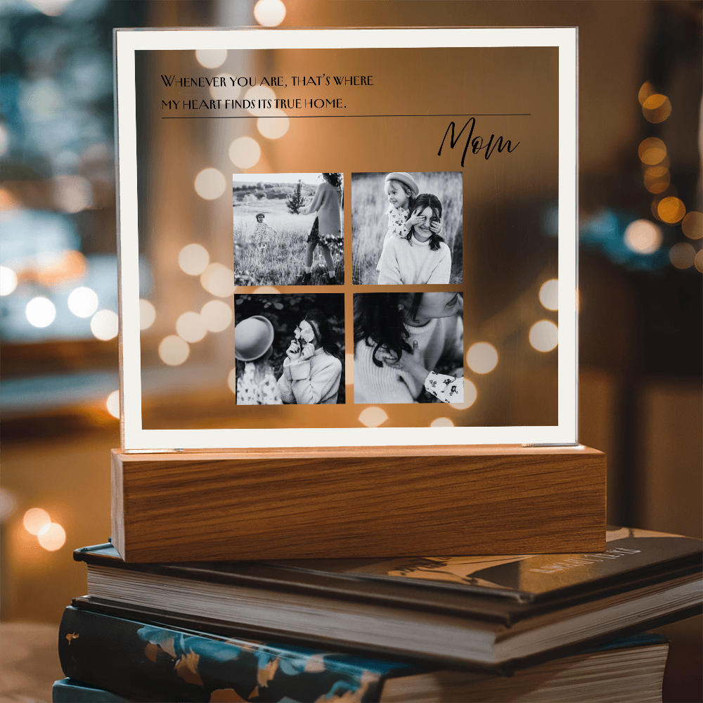 A meaningful way to celebrate Mom. This custom acrylic lamp displays your photos and message in a soft, warm LED glow — a beautiful keepsake she can cherish every day.